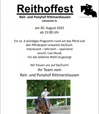 | © Copyright Reit.- und Ponyhof Rittmarshausen, Jan Reich | Letzte Änderung: 17.08.2025 | Erstellt mit